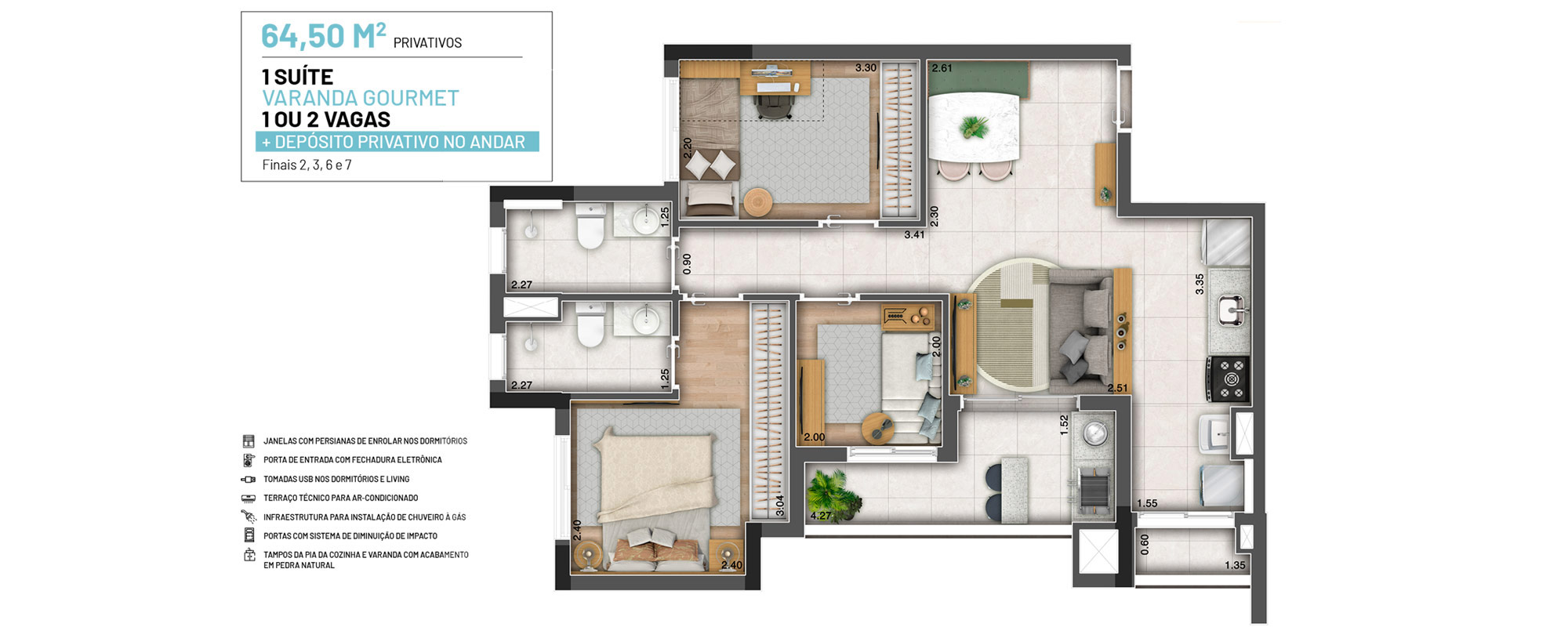 Ilustração da planta tipo. Móveis, objetos de decoração e utensílios, são meramente ilustrativos e não integram o memorial descritivo. Medidas de face a face em metros.